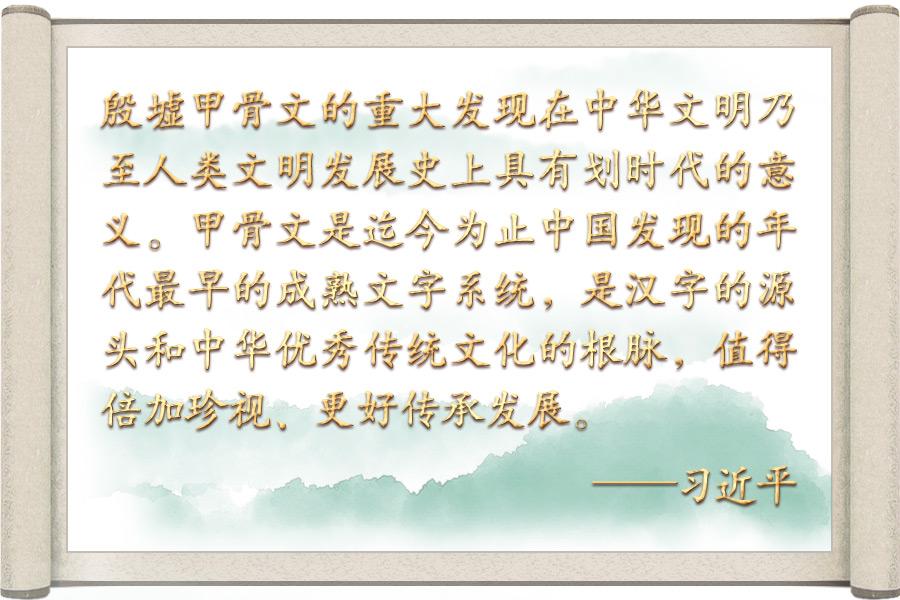 习近平总书记指出,殷墟出土的甲骨文为我们保存3000年前的文字,把中国信史向上推进了约1000年。殷墟我向往已久,这次来是想更深地学习理解中华文明,古为今用,为更好建设中华民族现代文明提供借鉴。中国的汉文字非常了不起,中华民族的形成和发展离不开汉文字的维系。在这方面,考古事业居功至伟。考古工作要继续重视和加强,继续深化中华文明探源工程。中华文明源远流长,从未中断,塑造了我们伟大的民族,这个民族还会伟大下去的。