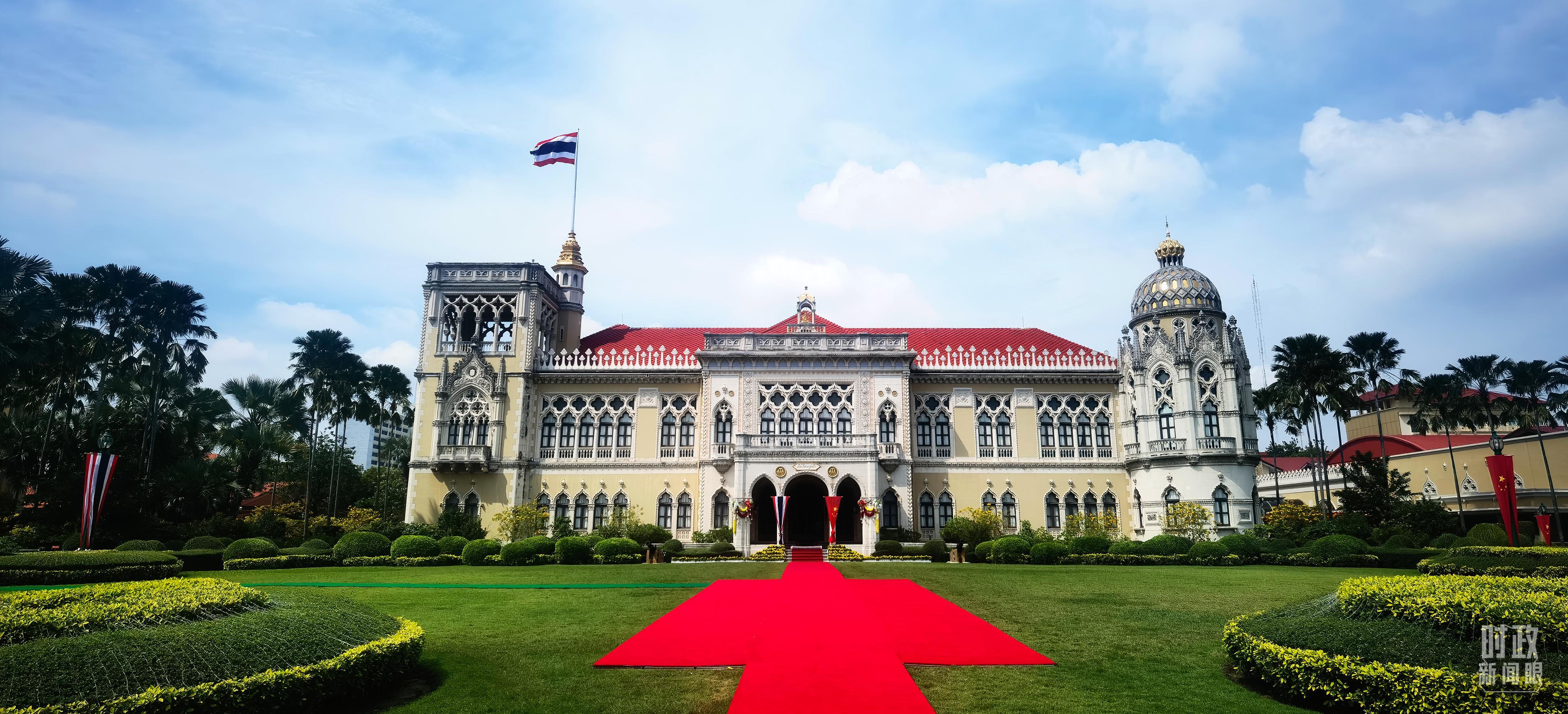 △曼谷总理府外的中泰两国国旗。(总台央视记者郭鸿拍摄)