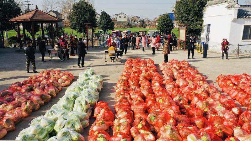 12月12日,柘城县市容环卫中心在皇集乡王克仁村开展“爱心蔬菜包”免费发放活动,为村民办实事。 张书珲 摄