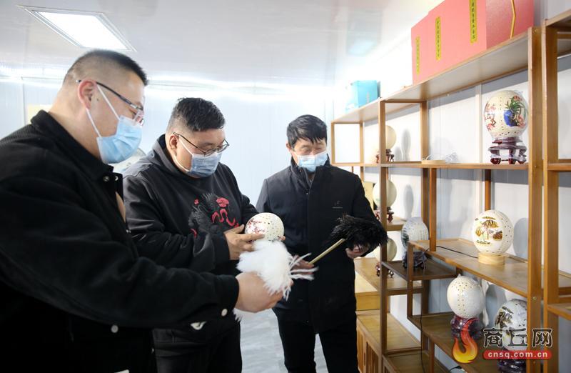 12月18日,返乡创业小伙蔡冰在向张弓镇相关领导介绍鸵鸟蛋壳工艺品。宁陵县张弓镇小吕集村蔡庄小伙蔡冰今年返乡创业,一期投资50余万元养殖鸵鸟,并将鸵鸟蛋壳雕刻加工成工艺品销售,深受市场欢迎。