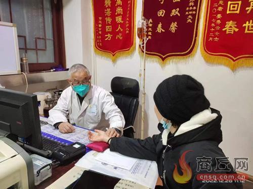 商丘市中医院医生李伟退休不褪色,边输液边为患者诊疗。 贾红霞 摄