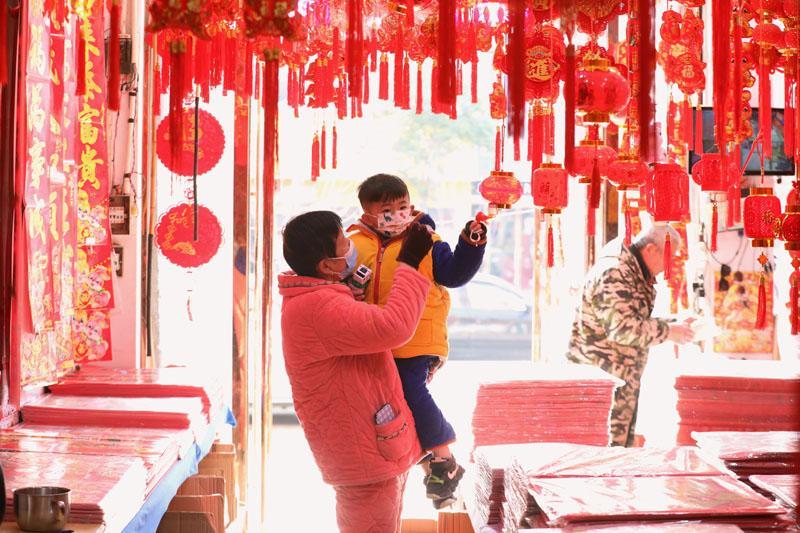 1月11日,柘城县市民在超市里选购新春饰品。春节临近,该县各卖场、超市里春联、福字、红灯笼、中国结、剪纸窗花等饰品琳琅满目,吸引了不少顾客前往选购,装扮美好的兔年春节。张 超 摄