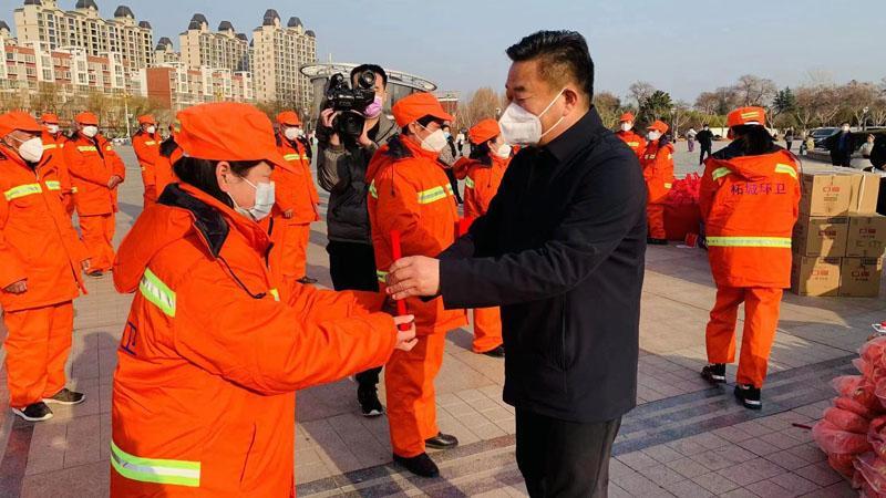 1月10日,柘城县在千树园公园举办冬季送温暖暨2022年度优秀环卫工人表彰仪式,共为全县环卫工作者发放棉鞋1200双、棉服1200套、春秋装1200套和米面油等慰问品。本报融媒体记者 蒋友胜 摄