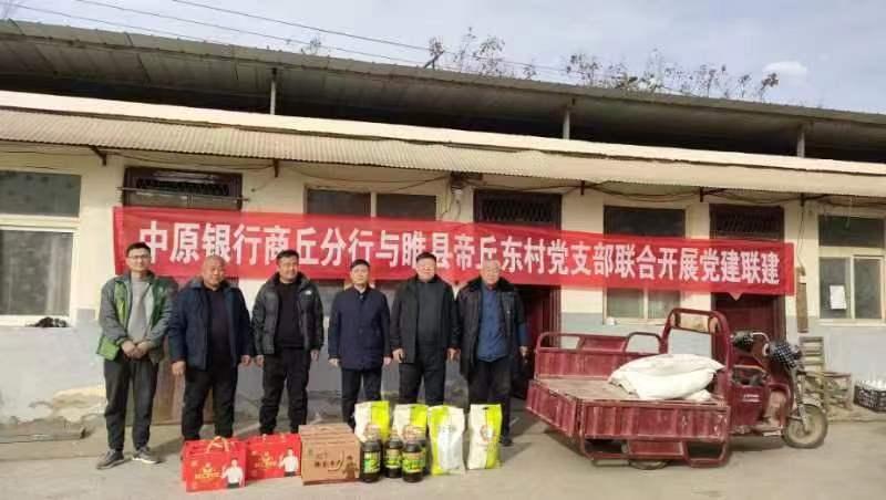 在兔年新春佳节来临之际,1月19日上午,中原银行商丘分行与帮扶村睢县帝丘东村党支部开展党建联建走访慰问送温暖活动,研究推动2023年驻村帮扶工作。
