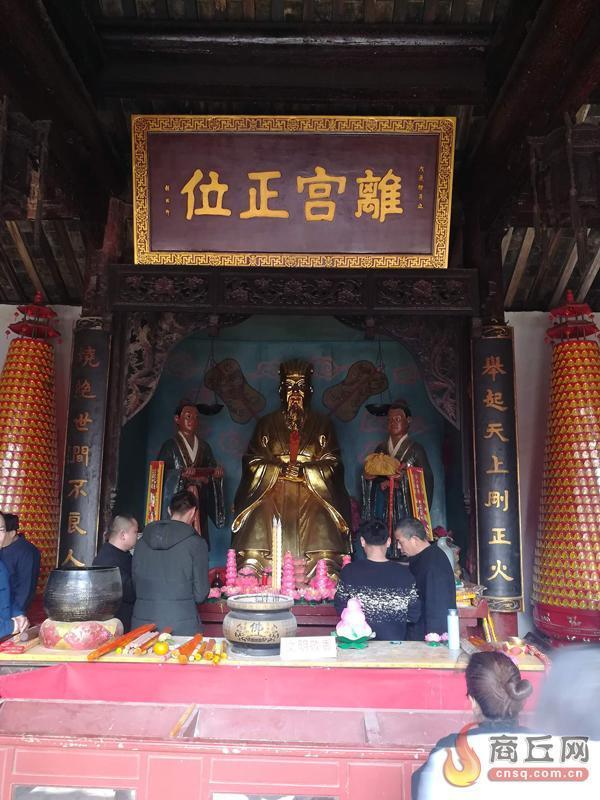 踏着陡峭的台阶登上台顶,回望下去,花戏楼、商祖殿、华商始祖雕像、三商之门景点尽收眼底。再从悬挂“阏伯台”三字大门进到院里,就看到供奉火神的阏伯殿了。据记载,元朝时期在阏伯台上建有大殿、拜厅、禅门、钟鼓楼,台前建有山门、戏楼等建筑,现在保留下来的建筑大多数是明清时期的。大殿是硬山式殿宇,殿宇的正中供奉着火神阏伯,金色粉身,给人一种高贵、庄重之感。塑像正上有牌匾书“离宫正位”四字,塑像前廊柱一副对联是:“举起天上刚正火,烧绝世间不良人。”正殿的东边是阏伯儿子的昭明殿,昭明殿正对处是鼓楼;西边是阏伯孙子的相土殿,相土殿正对处是钟楼。这边敲鼓,那边撞钟,寄托了人们对美好生活的向往。
