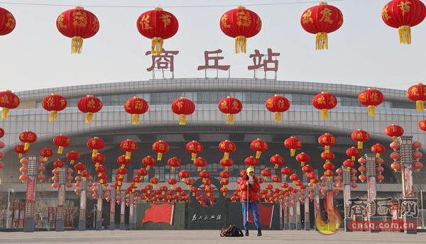 1月20日,旅客在站前广场拍照留念。商丘站北广场上大红灯笼高挂,年味十足。记者 邢 栋 摄