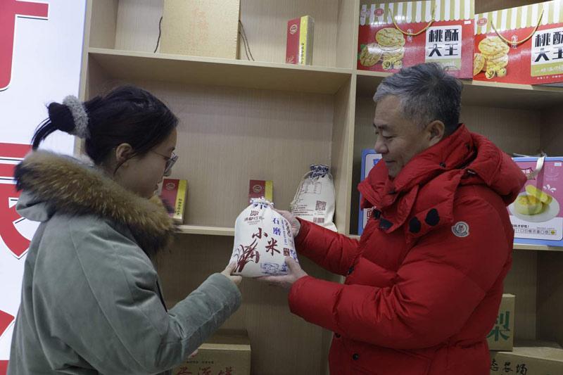 1月28日,在虞城马牧集老街“虞城县乡村振兴优质农副产品展厅”内,游客正在选购石磨小米。春节前夕,虞城县在马牧集老街建起了“人民日报第一书记直播间”和“虞城县乡村振兴优质农副产品展厅”,让来自各乡镇和高新技术产业区的上百种农产品登上线上线下销售平台。本报融媒体记者 刘建谠 摄