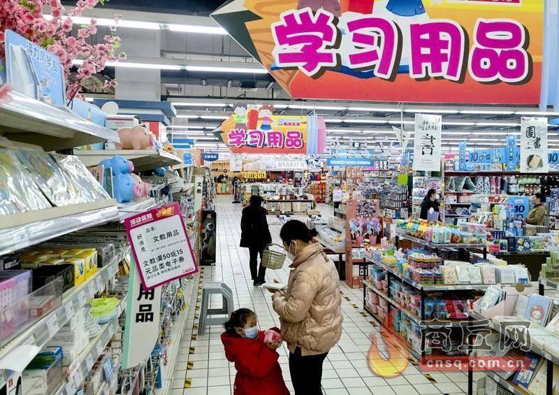 2月5日,在商丘市凯旋路旁的一家商场里,一名家长正在为孩子选购学习用品。记者了解到,商家在开学季推出了满“50元返15元购物券”的促销活动,吸引了不少市民的目光。个别商家还在App上推出了满99元免费送货到家的活动。