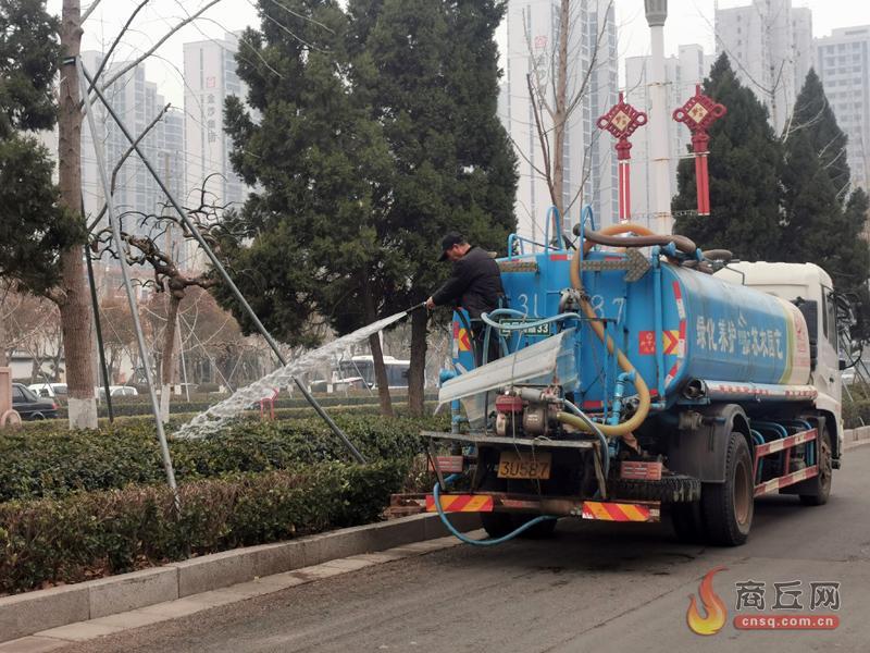 2月19日,园林工人正在给市区南京西路绿化带的苗木和行道树浇水。2月以来,我市园林绿化服务中心合理安排行道树和绿化带浇水作业时间,利用洒水车对绿化带苗木进行浇灌,确保春季苗木健康生长。