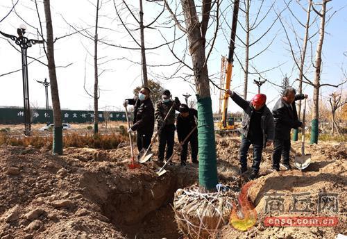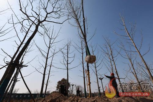 2月20日,工人正在商丘古城西南角的古宋河畔栽植银杏树。雨水节气后,天气回暖,正是栽植绿化树木的最佳时间,我市相关部门积极行动,抢抓时机,为城市添新绿。本报融媒体记者 魏文慧 摄