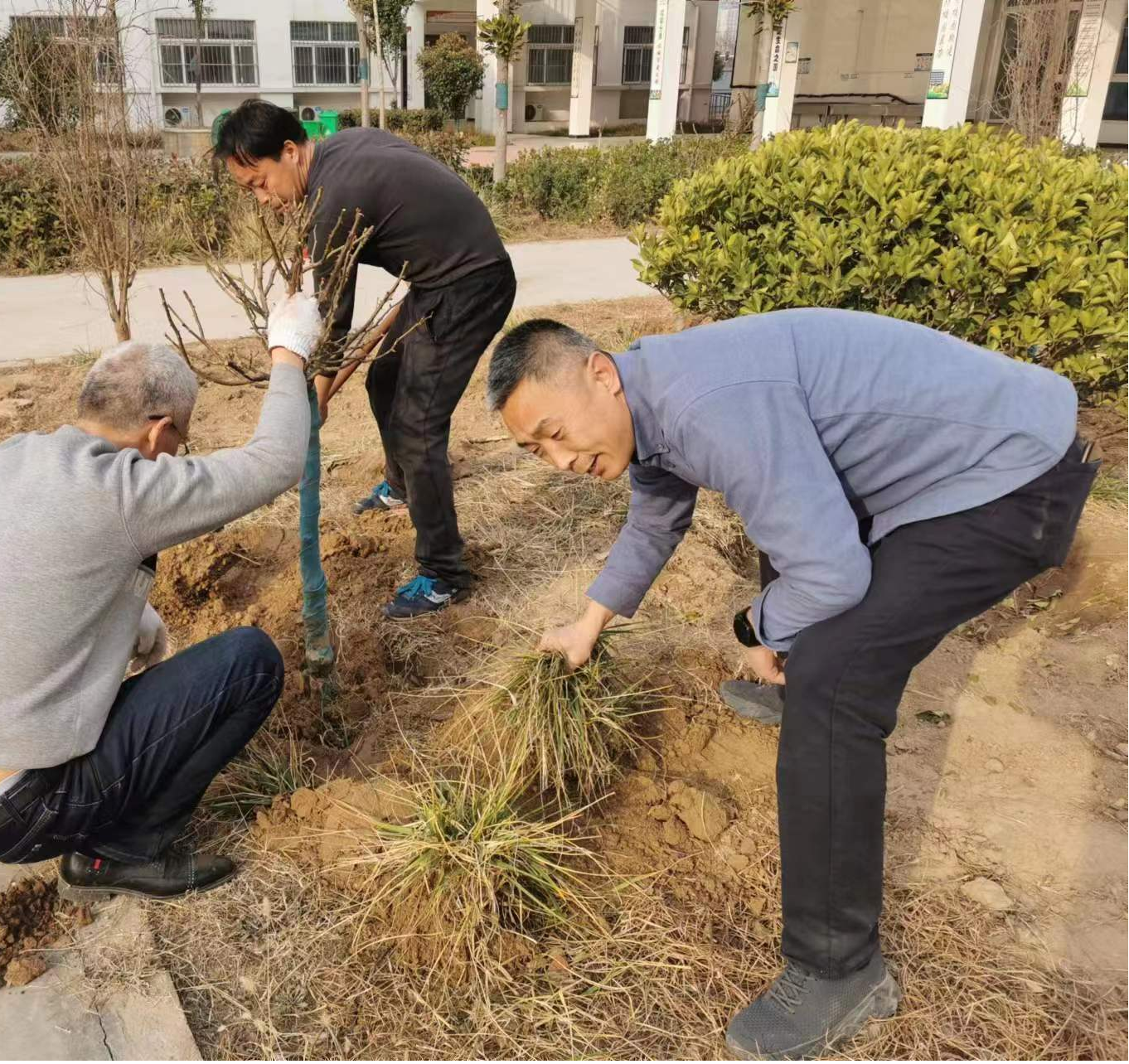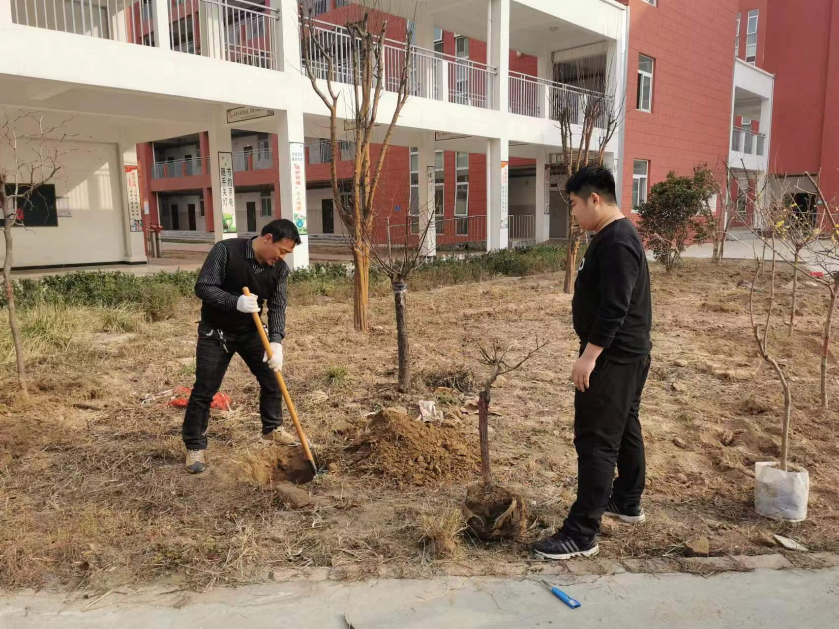 学校科学分解绿化任务,计划每年在校内分区域进行不同树种的栽植。在校长陈忠民的带领下,全体行管和没有上课的老师积极参与到植树栽绿活动中。