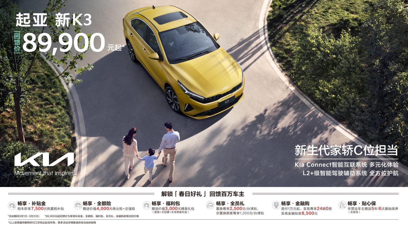 起亚精心为中国消费者带来了畅享·补贴金、畅享·全额险、畅享·福利包、畅享·全员礼、畅享·金融购、畅享·贴心保,六重礼遇。新车共推出2种动力车型6款车型,官方指导价为11.29万元-14.39万元,综合优惠后“放飞价”仅8.99万元起。新K3定位驾趣新生代家轿,产品实力全面进阶,旨在为年轻家庭带来高品质出行体验。