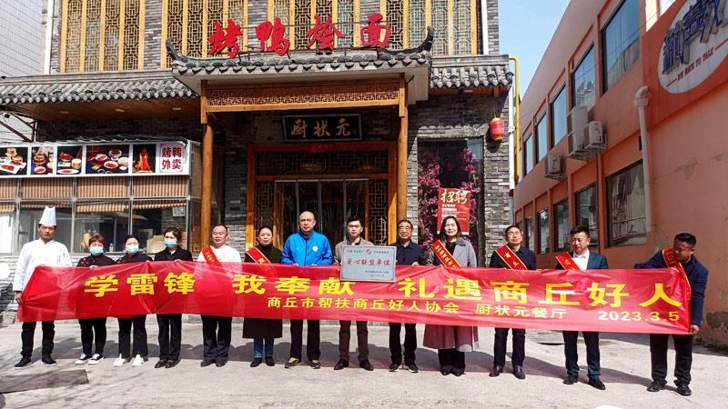 3月5日,商丘市帮扶“商丘好人”协会联合厨状元餐厅举行“学雷锋 我奉献 礼遇商丘好人”爱心联盟单位挂牌仪式。即日起,“商丘好人”、道德模范凭相关证明在位于归德路与淮河路交叉口东20米路北的厨状元餐厅就餐,可享受6.8折待遇。