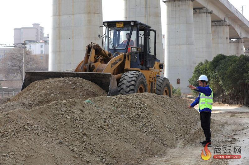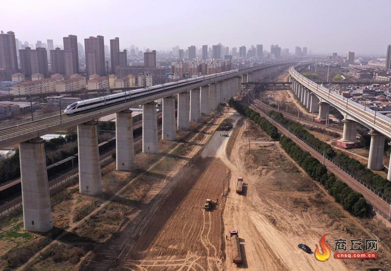 3月8日,记者在郑徐高铁与商合杭高铁交会处西侧拍摄的商丘动车存车场项目一角。记者在现场看到,多台推土机正在现场作业,目前正在进行路基填筑工作。据了解,商丘动车存车场项目占地485亩,计划投资5.5亿元,主要建设8条存车线、一座4线检查库、存预留高铁物流通道1台1线。项目建成后,可利用存预留高铁物流通道台、线发展高铁物流,打造商丘高铁快运物流基地,提升区域物流国际中转和国内货物快运能力。