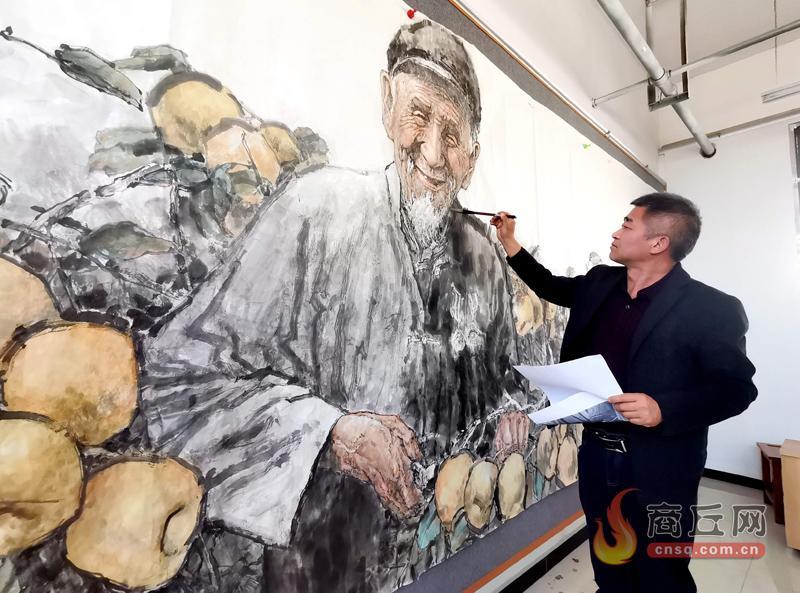 3月15日,著名画家王向阳正在创作以老坚决潘从正为主题的国画作品。宁陵县为了以书画艺术的形式再现潘从正一心为民、无私奉献的感人事迹及形象,特邀宁陵籍中国美术家协会会员、著名画家王向阳创作一幅长6米、高2.14米的巨幅国画作品。