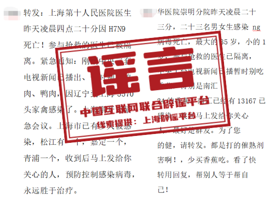 真相:近日,“上海第十人民医院医生因H7N9死亡”“华医院崇明分院多人感染ng病毒死亡”的信息在网上流传。经了解,近期上海各大医院均未出现上述死亡情况。同时,上海并无“华医院崇明分院”,疑似为“新华医院崇明分院”漏字的结果,而该院近期无相关事件。“ng病毒”的说法也不准确,这或是指“ng阳性”,也就是淋球菌感染。淋球菌是一种人体寄生菌,而相关谣言却称该病毒来自香蕉,完全是无稽之谈。