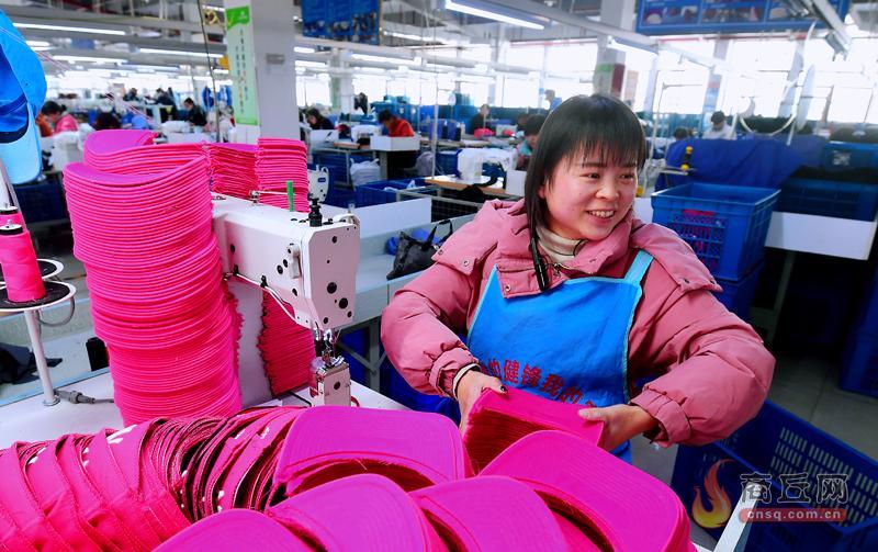 3月18日,夏邑县高新区健峰帽业员工在加班加点赶制订单,力争第一季度产销实现月月红。据了解,该公司占地120亩,总投资3.8亿元,年实现销售4.2亿元、纳税总额2500多万元,现有员工1600多人,产品远销全球38个国家和地区。