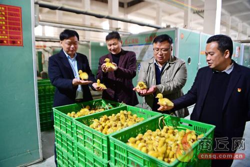 夏邑县郭店镇党委书记杨晓辉(右二)在桂柳牧业集团夏邑产业园鸭孵化车间观看鸭苗生长情况。本报融媒体记者 韩 丰 摄