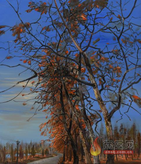 作品《地气》,是程俊鲤2009年创作的油画作品。原野上坚硬的车辙、幽暗的天空、光秃的树木,给人一种黎明前的苍凉和压抑之感。但蒸腾的地气喷薄而出,给人充满无限想象。也许这就是黄河故道留给画家的心灵密码,从荒凉走向繁华,从贫瘠走向肥沃,一切处在巨变的前夜。这里的地气可能就是民心吧!