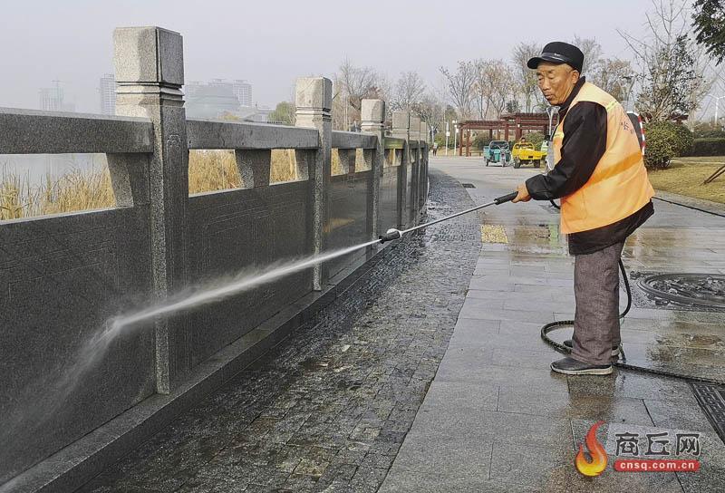 3月26日,环卫工人使用高压水枪,对日月湖景区内的大理石护栏进行冲洗。连日来,示范区采取有效措施,提升景区精细化管理水平,全力打造干净、整洁、亮丽的景区环境。