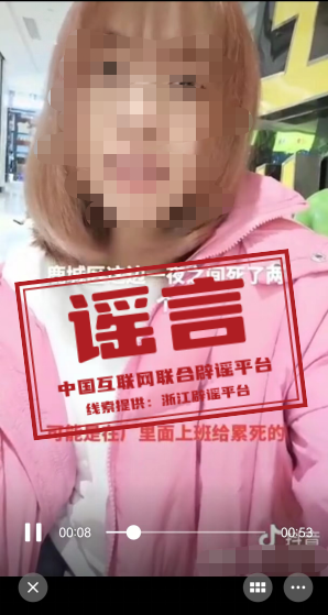 真相:近日,某网民在抖音平台发布“鹿城某地发生两起因加班造成的非正常死亡”相关信息。经浙江省温州市鹿城区网信办调查核实,确认该信息属于虚假信息,该网民行为已涉嫌违反《浙江省人民代表大会常务委员会关于网络虚假信息治理的决定》。鉴于该视频发布后已有多人点赞、转发和评论,造成一定范围传播,扰乱了社会公共秩序,鹿城区网信办随即联合区公安分局对该网民进行约谈。(来源:“网信温州”微信公众号)