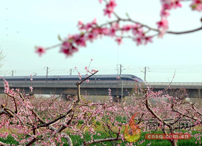 3月28日,宁陵县柳河镇桃园关村,一列和平号动车从桃花丛中疾驰而过。随着天气变暖,宁陵县各地的桃花、梨花、油菜花盛开,春意盎然,春景如画。 吕忠箱 摄