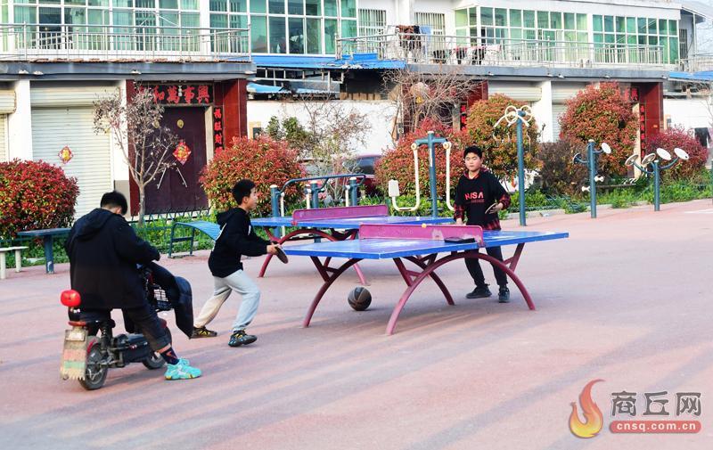 4月5日,夏邑县桑堌乡大李庄村小学生在村体育活动广场打乒乓球。该村实施乡村人居环境综合整治,加强文化基础设施建设,丰富了群众的文体生活。记者 韩 丰 摄