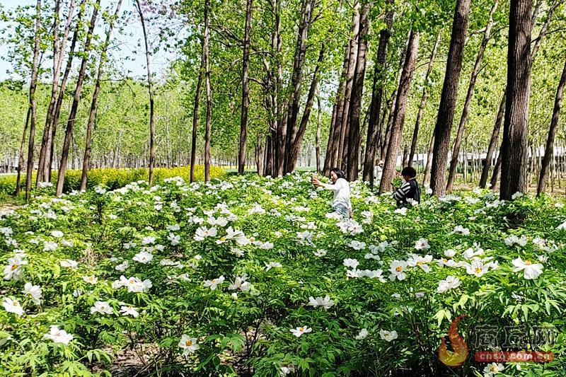 游客在睢县榆厢森林公园芍药种植基地赏花拍照