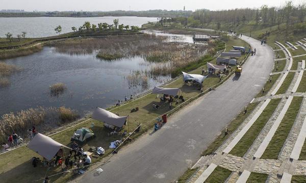 市民在商丘古城景区西北片区露营休闲(无人机照片)。