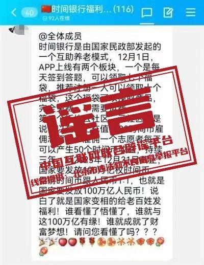真相:近期,中国银保监会通过日常监测发现,个别网站发布“中国时间银行上市”等虚假信息,有名为“时间银行”的移动应用程序(App)以公益养老为名目开展投资活动。对此,中国银保监会表示,其从未批准设立“中国时间银行”,相关网站、社交平台、App等所称“中国时间银行”有关内容均为虚假消息,相关投资活动涉嫌违法犯罪,请公众谨慎辨别,谨防上当受骗。