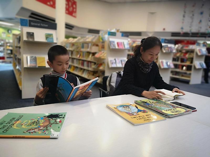 常竹带着孩子一起阅读英文原版书籍。 本报融媒体记者 戚丹青 摄