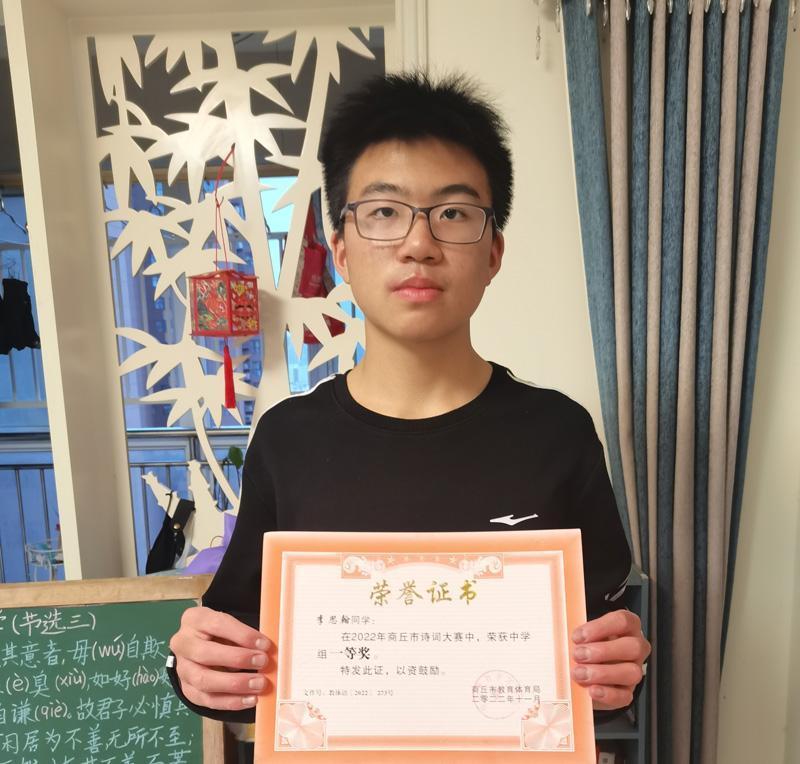 功夫不负有心人,通过多年的积累,这个14岁的少年储备了大量的古诗词。2022年,他获得商丘市诗词大赛中学组一等奖;2021年,他获得商丘市诗词大赛小学组特等奖、河南省诗词大赛小学组二等奖,还入围了中央广播电视总台举办的中国诗词大会面试。