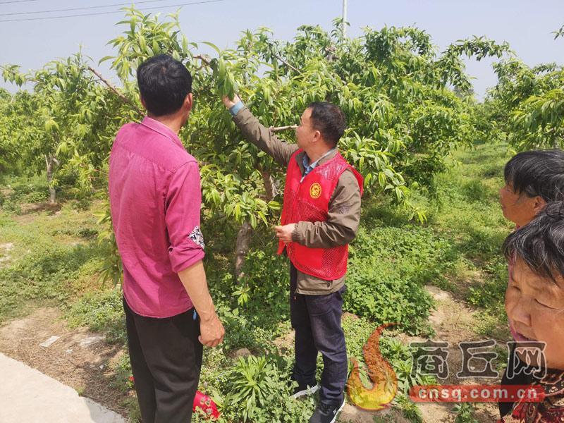 “4月份是桃树生产管理中保果、保叶的关键时期。在果实管理方面,要根据枝条类型确定每根枝条的留果量,对果树上的小果、畸形果、病虫果要全部疏除,避免养分消耗。要做好果实硬核期和果实第二次迅速生长期的追肥、灌水,重点施好果实膨大肥,同步做好桃树的病虫害防控,积极推广以农业防治、物理防治、化学防治为主,生物防治为辅的绿色防控技术,提升桃树产量和品质。”张伟、王娜还在杨满意的带领下,来到宜家种植养殖专业合作社的桃树栽植基地,为正在管理桃树的果农讲解桃树栽培管理技术要点。