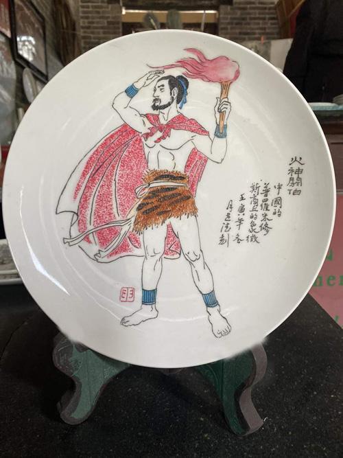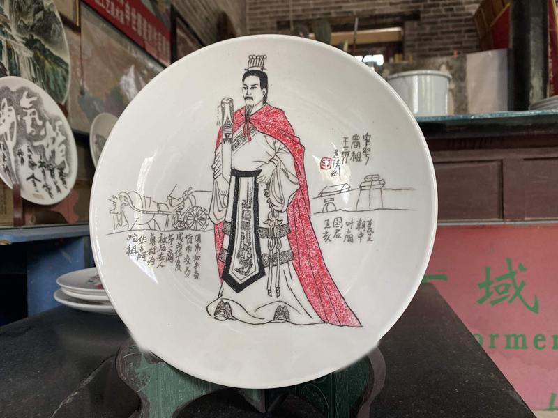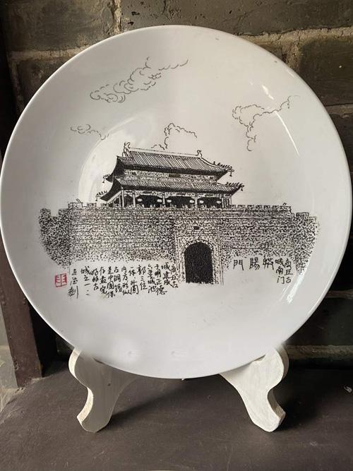 在申世德工作室展示的作品中有很多“商丘元素”。“商丘古城”“玄鸟生商”“火神阏伯”“王亥经商”“木兰从军”“桃花扇”等,这些关于商丘的系列作品在瓷盘中显现,显得高雅而庄重。“其中《商丘古城》刻瓷作品销量最大,很多游客把这件作品当成旅游纪念品,几乎每周都有游客购买。应游客的要求,有时候还会刻上游客的姓名和‘到此一游’字样。”申世德说。