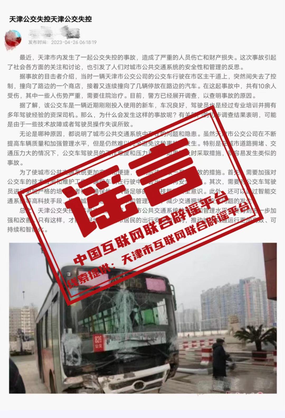 真相:近日,有关“天津公交失控”的信息在网上传播,声称:“近日天津一辆运载20余名乘客的公交车冲上人行道,撞上附近建筑物,造成多人死伤。”经天津市交通运输委核实,近期天津公交各运营公司均未发生类似事件,网传信息不实。(来源:“天津辟谣”微信公众号、“天津交通运输”微信公众号)