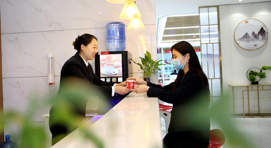 今年30多岁的刘芳,是人民信用社的老客户,进门看到人员多,就径直来到大厅南侧的休息区。工作人员郝翠翠随即帮她冲了一杯热咖啡,刘芳起身走到阅读区选了一本喜爱的书,品着咖啡的香甜边翻阅书籍边等待叫号。这,只是人民信用社优质服务的一个缩影。