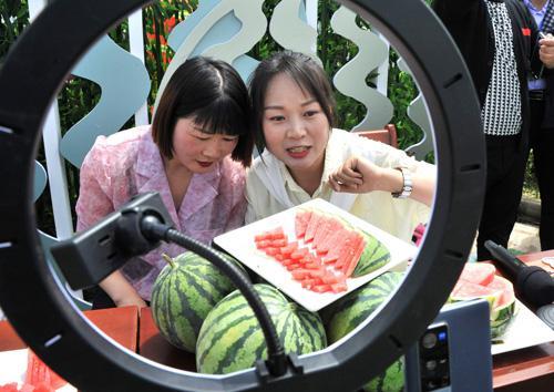 为使夏邑西瓜产业搭上网销快车,夏邑县电子商务中心积极组织电商企业助力西瓜文化节,活动当天,多家电商直播企业在现场进行直播活动(如上图。夏天 摄)。该中心还在现场组织公共品牌“栗城农珍”等农业产品在现场展销,吸引了大批群众浏览和咨询。