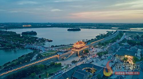 5月14日,夜幕降临,商丘古城华灯璀璨、流光溢彩,映照着一湖碧水,梦幻多姿,令游人沉浸其中。