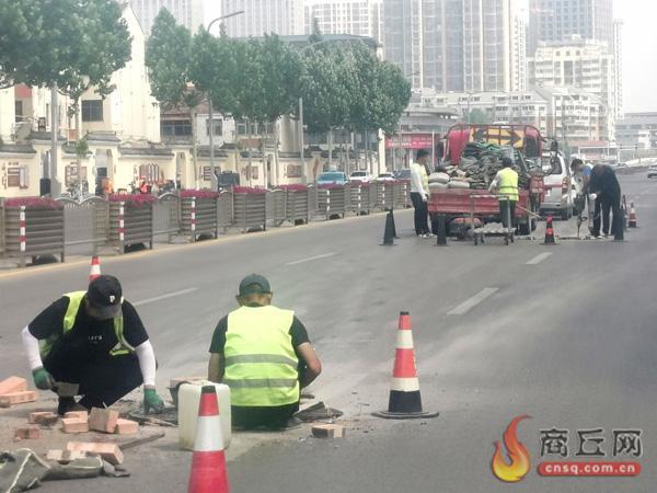 5月25日,市区归德路中段,市政工作人员正在对井盖进行升级维修。为确保强降雨期间群众出行安全,市政管理部门近日开展了全市井盖设施隐患排查整治行动。记者 邢栋 摄