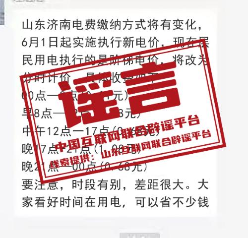 真相:近日,一则“济南电费缴纳方式将由阶梯电价改为分时电价”的帖子,在网络平台和微信群流传引发关注。对此,济南市发展改革委回应称,根据6月1日起实施的《山东省发展和改革委员会关于山东电网第三周期输配电价及有关事项的通知》规定,目前济南居民生活用电电价仍执行现行目录销售电价,网上流传为不实方案。(来源:山东互联网联合辟谣平台)