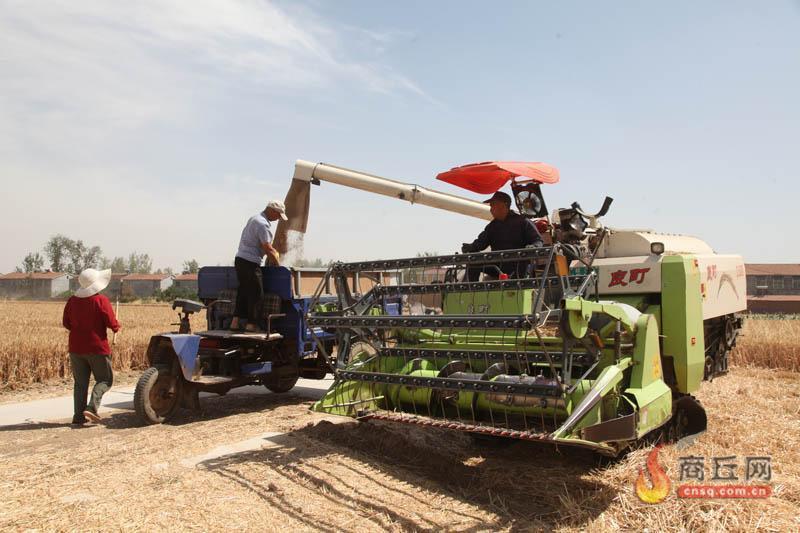 6月2日,一台大型收割机在夏邑县中锋乡朱双楼村地头装卸收获的小麦。连日来,我市各地抓住有利时机,抓紧抢收小麦。 据市农业农村局农情调度统计,截至6月2日16时,我市已收获小麦33.25万亩(占全市种植面积的3.55%)。