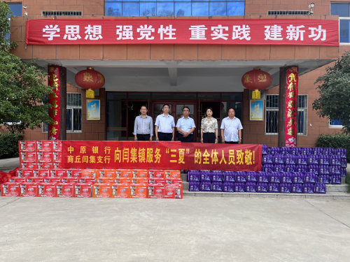 当前,闫集镇麦收工作已经全面展开,在“三夏”生产暨秸秆禁烧工作的关键时期,全体镇村干部,冒高温、顶烈日,严防坚守在禁烧一线。2023年6月3日上午,中原银行商丘分行闫集支行葛庆宝一行向闫集镇政府捐赠了60 箱方便面、120件矿泉水、150件中原银行志愿者红马甲和宣传条幅等爱心物资,表示对闫集镇“三夏”秸秆禁烧工作的全力支持。