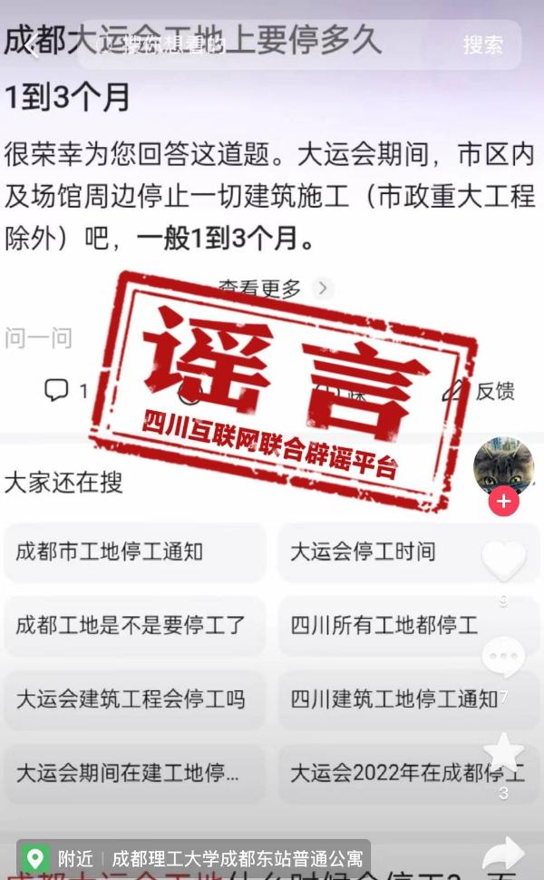 目前,距离备受期待的成都大运会仅一月有余,至此之际,有网传消息“在大运会期间全市范围内在建工程项目要全部停工”同时给出具体停工时间;对此,记者浏览社交媒体、搜索页面等,搜索“大运会期间”,“大运会期间成都周边的工地是否停工”“大运会期间工厂会停工吗”成置顶选项,可见大运会期间是否停工也是很多人关心的话题。