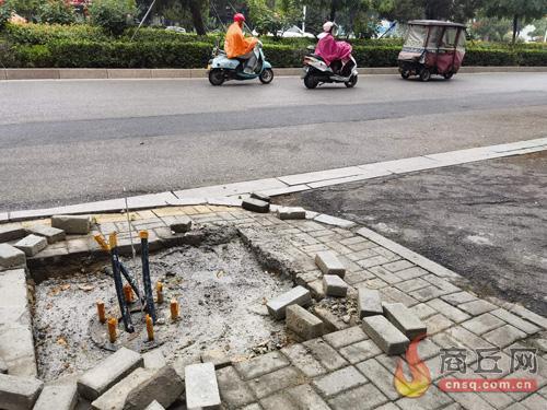 记者报告:“神火大道运河桥向南路东的人行道上,掀开了透水砖进行施工,却没有完善防护措施。”李女士说,她平时经常从该处人行道经过,看到开挖后的区域没有设置防护措施,而且有电缆线露在人行道地面上,“电缆线有几十厘米长,断口处就朝向天空,也不知道有电没有”。
