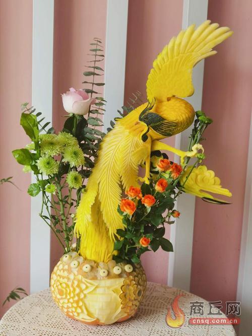 随后,他又拿出前一天雕刻好的各种配件进行组装,这组作品的名字叫《有凤来仪》,用红心萝卜雕刻的玫瑰花娇艳欲滴,用南瓜雕成的石头厚重坚稳,用胡萝卜和南瓜雕刻的凤凰在花朵的映衬下展翅欲飞。而另一组作品《丰收花篮》,则是用南瓜雕刻而成,里面搭配着用胡萝卜雕成的百合花,娇艳生姿,好像能闻到花香。