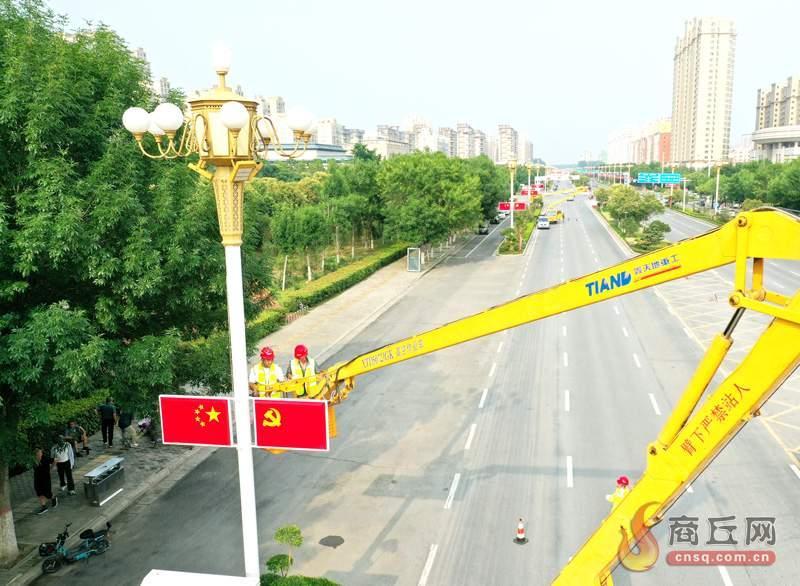 图① 6月27日,民权县亮化服务中心工作人员在人民路安装灯箱。据悉,“七一”前夕,该县在主要路段、文化广场等公共场所设置和安装了建党102周年宣传标识,营造了“听党话、跟党走、感党恩”的浓厚氛围。