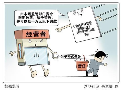 针对消费者反映较为强烈的经营者利用不公平格式条款减轻或者免除自身责任、加重消费者责任、排除或者限制消费者权利等行为,以及经营者就格式条款向消费者进行提示说明、不得借助技术手段强制交易等义务,办法作出详细规定。上述违法行为由市场监管部门责令限期改正,给予警告,并可以处十万元以下罚款。 新华社发 朱慧卿 作