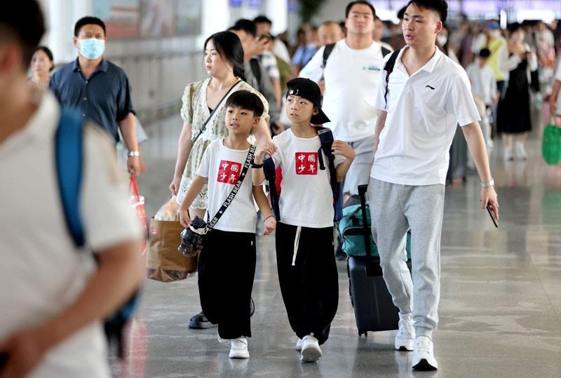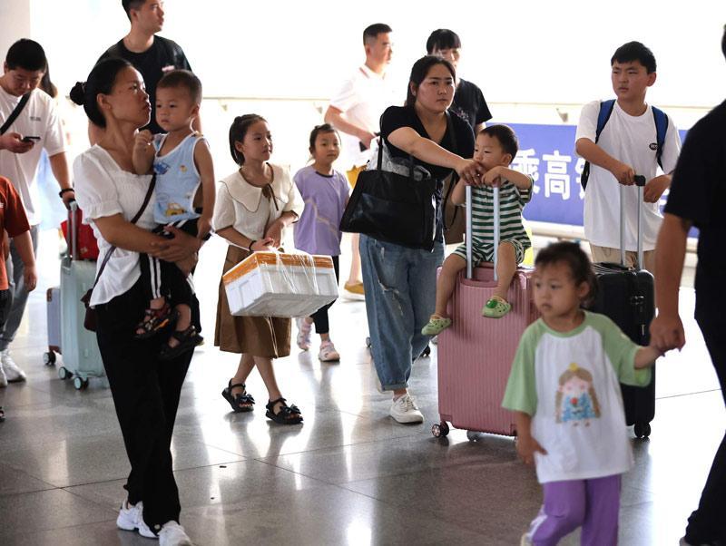 7月12日上午,在商丘火车站进站走廊,客流中有很多小朋友。他们有的自己拎着小书包,有的跟在家长身后,有的还在长辈怀里。暑运期间,商丘站除日常的商务客流外,学生客流大幅增加。据悉,每年暑假,都会有大量的孩子到他们父母打工的城市生活,与父母共度暑假时光。本报融媒体记者 魏文慧 摄