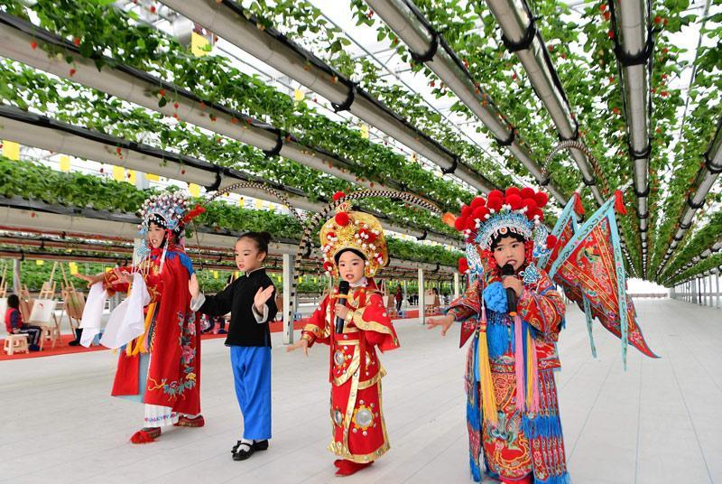 小戏迷把夏邑县太平镇龙港湾的空中草莓园当舞台。