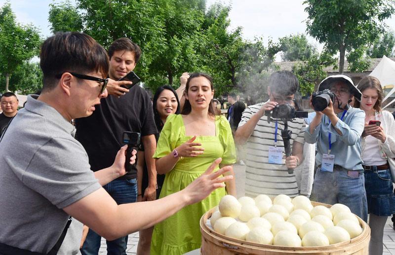 外国朋友在夏邑县太平镇龙港湾惊叹“中国馒头”。